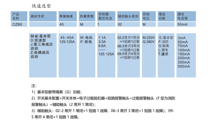CZB0系列控制与保护开关电器集成了断路器(熔断器)、接触器、过载(或过流、断相)保护继电器、启动器以及隔离器的主要功能,有效减少了电机控制系统中的产品种类、规格及数量,解决了分立元件之间的协调配合特性问题。